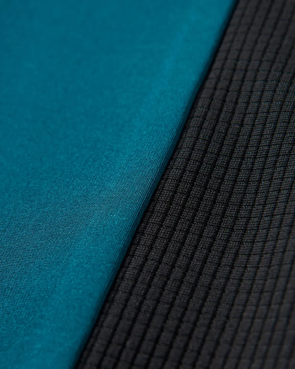 Made from a Recycled Polyester and Polyurethane blend, with a moisture wicking finish to help keep you dry.